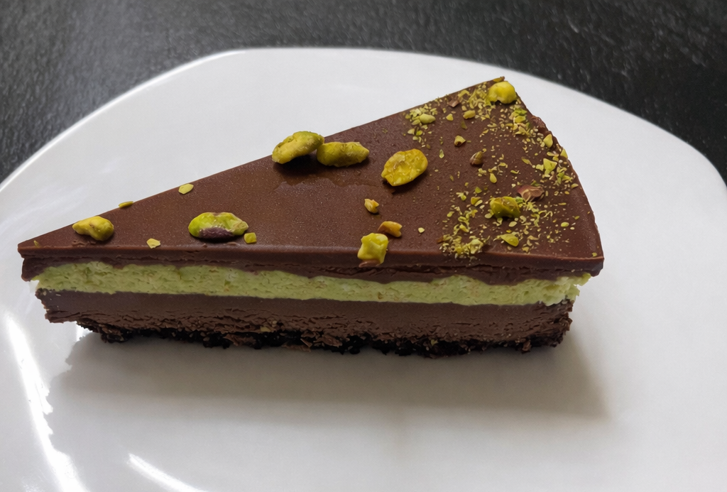 Шоколадная глазурь, сливочно-сырная начинка, фисташковая паста, тесто катаифи