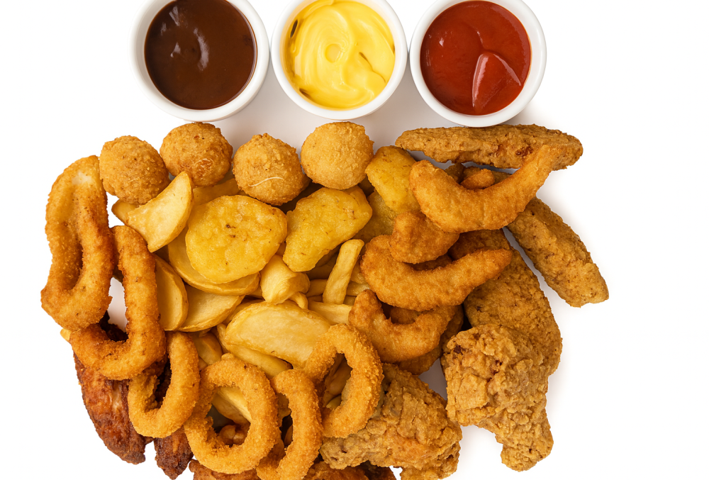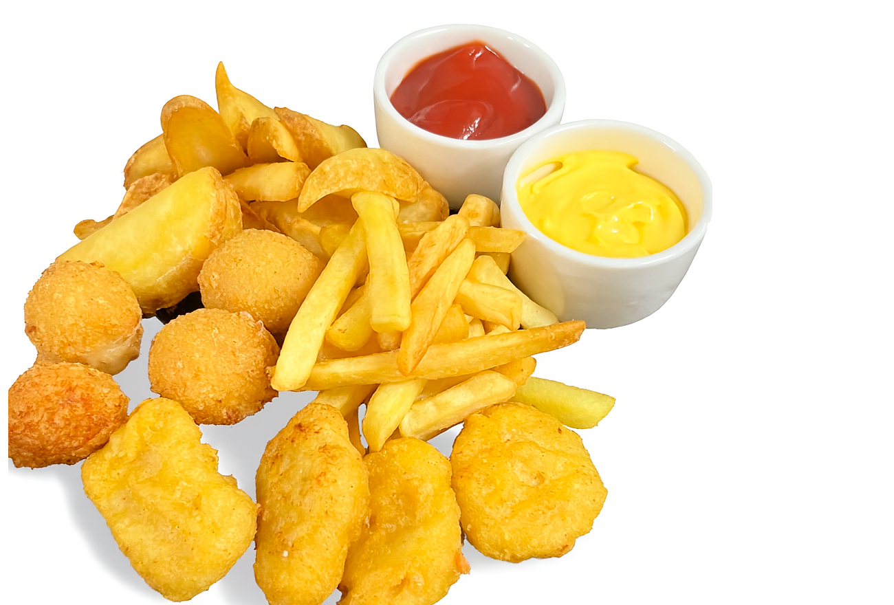 Наггетсы куриные, Сырные шарики, Картофель фри, Дипперы картофельные, Соус Томатный, Соус Сырный