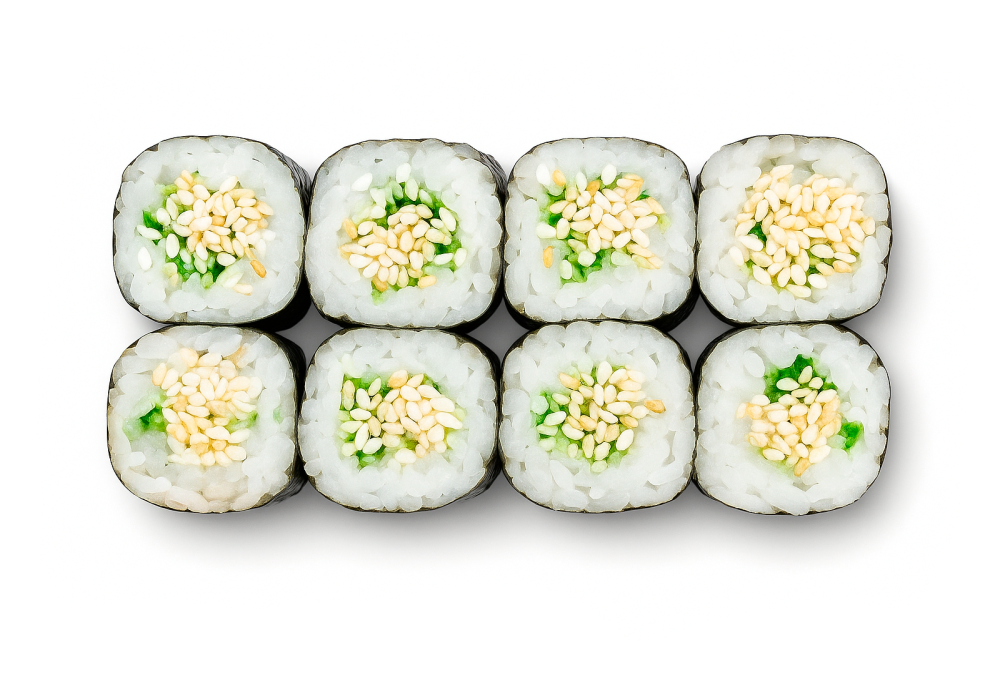 Нори, рис, сыр творожный, огурец, помидор, салат айсберг, кунжут