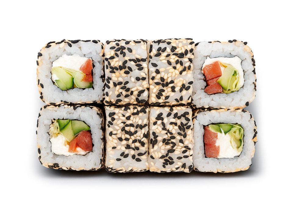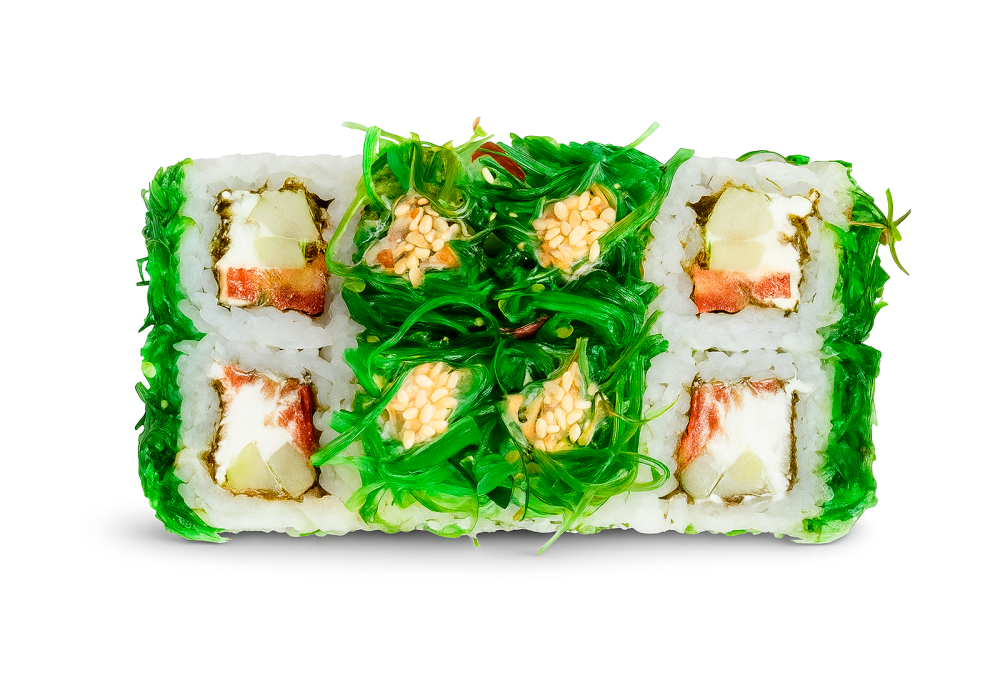 Нори, рис, сыр творожный, авокадо, помидор, чука, соус кунжутный, кунжут