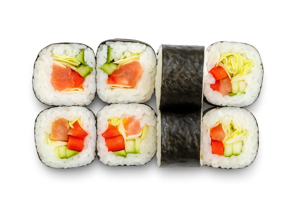 Нори, рис, фета, огурец, помидор, болгарский перец, чеддер, соус унаги